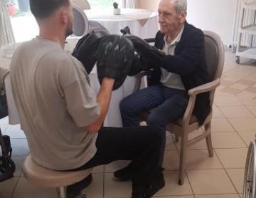Les Jardins des Acacias > Actualités > Boxe Boxe Publiée le 16/04/2025 Aujourd'hui, les résidents ont la chance de participer à un cours de boxe, spécialement pour se stimuler, se divertir tout en prenant du plaisir!