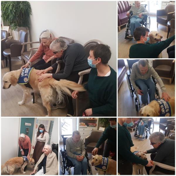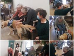 A raison d'une séance tous les 15 jours, Marine (psychomotricienne DE) et Toupie (golden retreiver qui a été spécialement éduqué pour intervenir auprès de notre public) animent un atelier auprès de certains résidents. En groupe ou en individuel ces résidents participent à un atelier dont l'objectif est de réveiller des réactions visant à maintenir ou a améliorer son potentiel cognitif , physique, psychosocial ou affectif.
